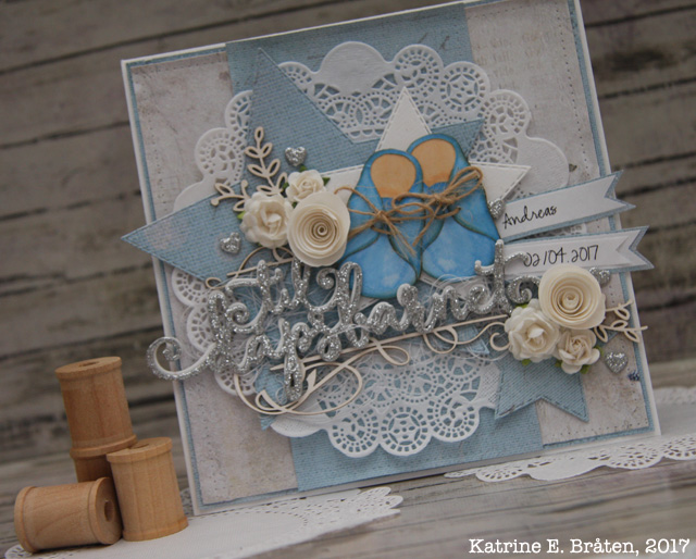 Jeg har laget et dåpskort som inspirasjon til denne utfordringen. Kortet måler 5,5x5,5" og basen er hvit kartong fra Papicolor. Mønsterarkene jeg har brukt kommer fra Studiolight, Home&happiness serien. Jeg har stanset ut stjerner i forskjellige størrelser, både av mønsterark og kartong. Teksten er stanset ut i hvit kartong og glittermosegummi i sølv, og limt litt skjevt på hverandre for illusjonen av en skygge. Jeg har også stanset ut noen små hjerter i glittermosegummien med en die fra Kort&Godt, snurreblomstene komme også derfra. Chipboard fra Scrapiniec. Produkter fra Papicolor og Studiolight, samt produkter som mosegummi med og uten glitter, distribueres i Norge av Global Hobby og Kunst.