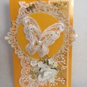 Jeg har valgt å lage et kort med utgangspunkt i en bakgrunn laget med Cosmic Shimmer Pixie Powder. Jeg har valgt meg knalle farger både på bakgrunn, ark og pynt.