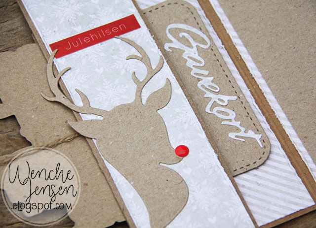 Fronten på kortbasen har jeg brettet inn slik at den danner ei lomme. Stanset ut gavekort og puttet i lomma. Finnes ikke koseligere gaver enn et gavekort på en hjemmelaget middag, en tur sammen på kino eller for eksempel hjelp i huset til noen du vet har behov for det.